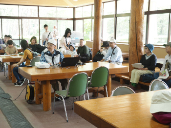 | 1.きのこ採取に出る前に、講師からスライドで主に毒きのこについて解説がありました |