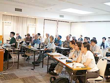 福島きのこの会総会は、会計報告などの議事が順調に進み、日程どおり滞りなく終了しました。 シンポジウム等の終了後に行われた、夕食を兼ねた懇親会は大いに盛り上がり、会場のあちらこちらで立ったまま意見交換が盛んに行われていました。私(サイト管理者)にとっても、「さすが研究者の懇親会だ」と感じるほど活発な雰囲気でした。懇親会の2時間はあっという間に過ぎてお開きとなりましたが、その後はいくつかの部屋に分かれて二次会が続き、日付が変わるまで交流が続いた部屋もあったようです。 翌日のきのこ採取では、2週間ほど雨が降らず、地面がかなり乾燥していたため、きのこの発生が非常に少なかったことが残念でした。 |